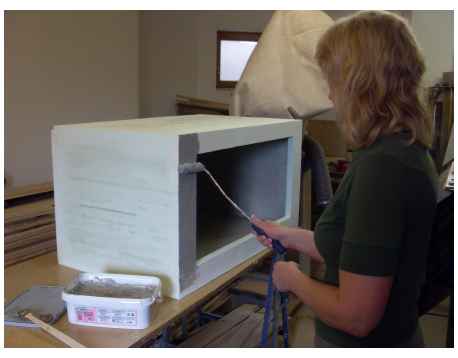 Ein weiteres Material, welches für den Bau von Terrarien geeignet ist, ist Styrodur. Es sieht so aus wie Styropor und hat auch ähnliche Eigenschaften, aber eine wesentlich höhere Festigkeit. Auch hiermit lassen sich Terrarien in fast jeder beliebigen Größe herstellen. Gewöhnlich kann man die Styrodurplatten in den Abmessungen 125 x 60 cm in jedem Baumarkt bekommen. Die Zuschnitte kann man bei diesem Material auf einer ganz gewöhnliche Kreissäge, mit einer Stichsäge oder mit einem ganz normalen Teppichmesser zuschneiden. Die Kanten, die sich berühren, werden mit einem Styrodurkleber eingestrichen und verklebt.